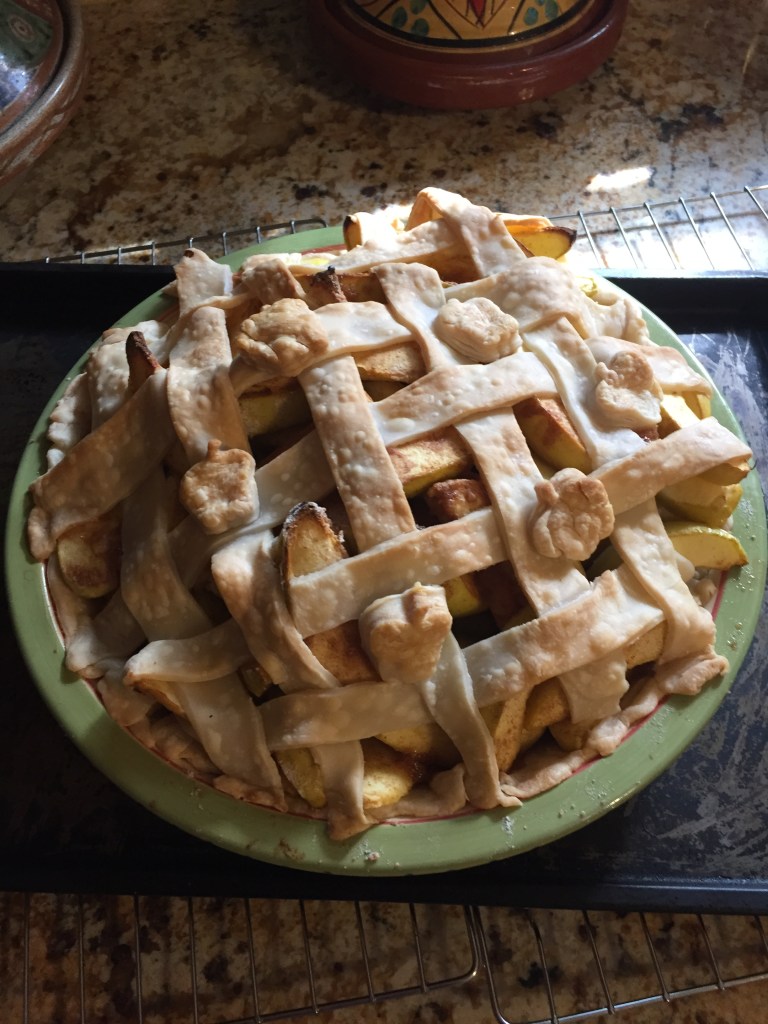First, the pre-made pie crust in my greased pie pan. Next the pre-sliced apples tossed with brown sugar, a little salt, a bit of flour, and about a tablespoon of cognac. The Williams Sonoma Baking book showed how to make a lattice crust. Part of my undergraduate degree included weaving, so I thought I’d do the lattice.