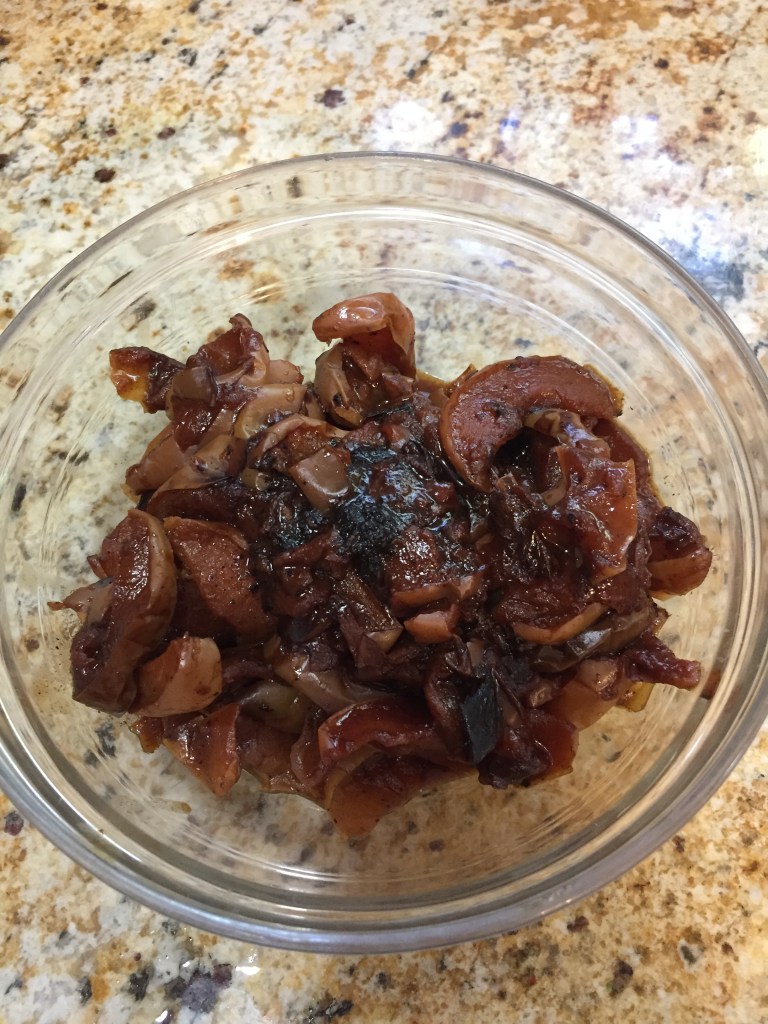 Time to repurpose. All these years of watching Chopped has made me confident to take one thing and transform it into another. The next morning, I got rid of the ill-fated crust and put the apples and as much of the brown sugar caramel around them into a saucepan with water – apple compote. It took a long time to cook down, does not look appetizing in its brownness, but is really good.