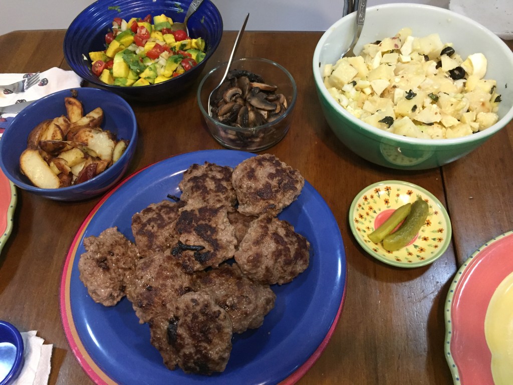 Labor Day Weekend, like other 3-day weekends is a time for picnics. Our picnic this year was at home – the family is still relatively homebound in semi-isolation. In deference to the picnic theme we had burgers one night. Mine are bison, in this case a 1-1 mix with beef, cooked in the skillet seasoned with onion powder, garlic powder, oregano, salt & pepper. No outdoor grill for us.