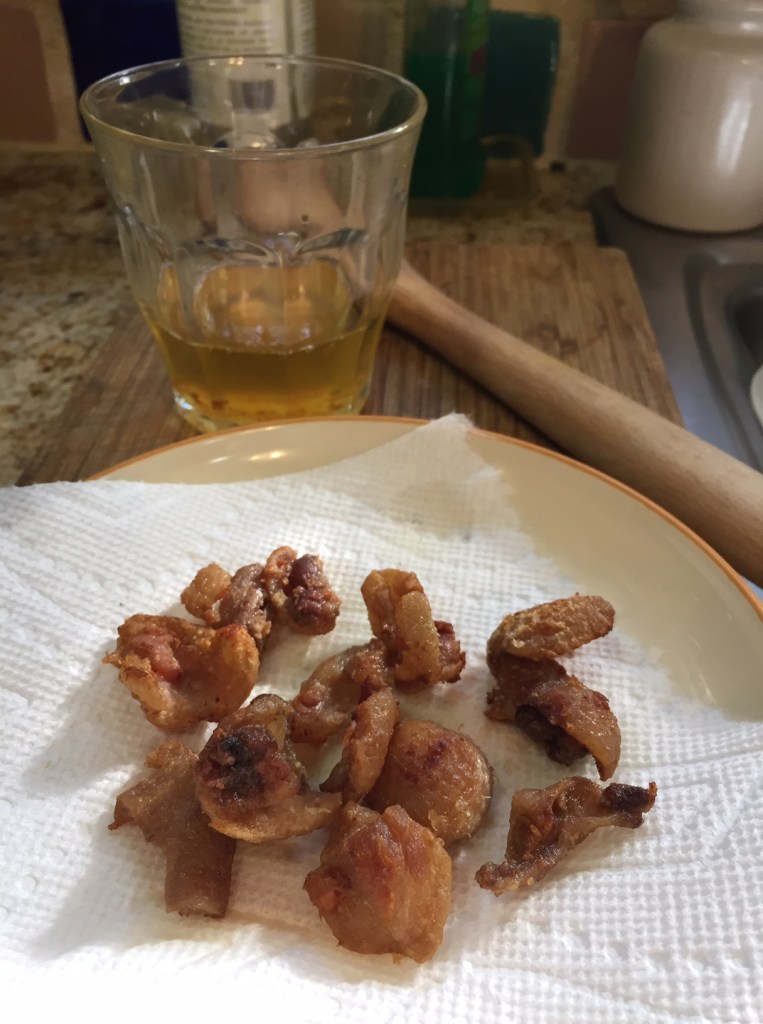 And so, the duck. One of the Jewish cooking zooms I followed in the early days of our stay in Hotel California feature gribenes made by rendering chicken fat to make that golden treasure, schmaltz. Dial that one up and render your duck fat – that is melting down the skin and fat scraps from the bird. Your end product is some lovely, yummy duck fat for future use and crisply, crunchy pieces of fried skin. Actor Joshua Malina compares gribenes to pork rinds (https://100jewishfoods.tabletmag.com/gribenes/).