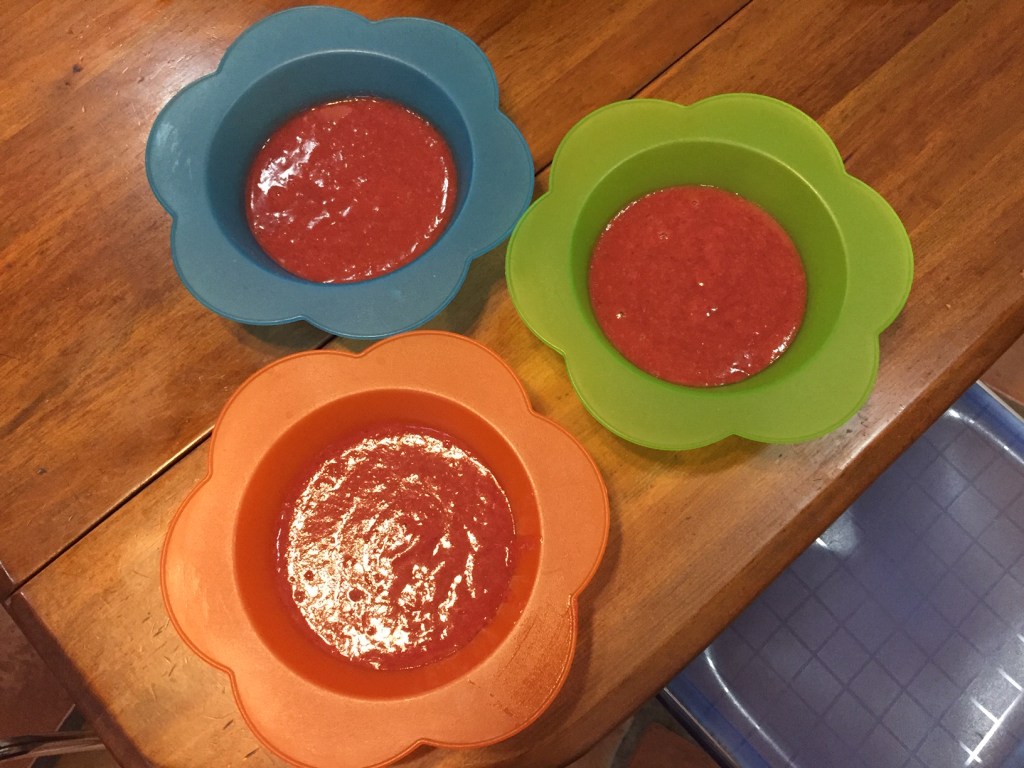 The pièce of that meal was also mined from the deep freeze – strawberry soup. This is so simple. I must have had one or two pints of frozen berries. Put them into a saucepan with their juices, some water, 2-3 tablespoons of sugar, and a cup of a nice dry white wine (the rest to be drunk with dinner!). Bring to a boil, then simmer for about ½ hour. Process til smooth with an immersion blender and chill before serving. This was Daughter’s first fruit soup. She was sold on it.