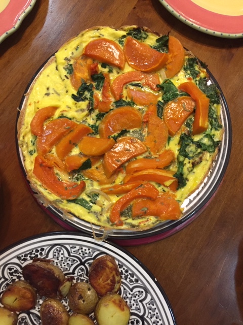 First was another variation on frittata, a new favorite of daughter. This time, thanks to Bon Appetit. The fairly easy recipe calls for 1 small butternut squash peeled, seeded, and cut in half. Then slice in ¼” thick slices (next time, I’ll make it smaller cubes). Toss in oil on a baking sheet and bake til tender (I did about 1/2 hour.)