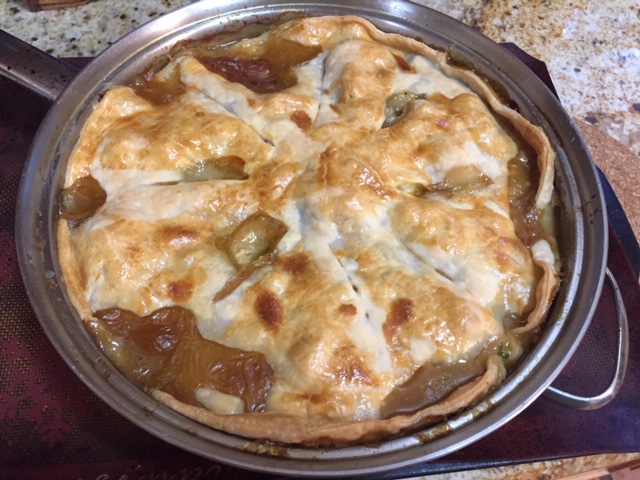 The recipe calls for puff pastry from the grocery store. I used pre-made pie crust to top the skillet. Brush with an egg wash (one egg whisked with a tsp of water), then cut slits in the top to vent. Bake the pot pie for 15-20 minutes til the crust starts browning. Reduce the heat to 375 degrees and bake another 15-20 minutes. Let it cool for 10 minutes before serving.
