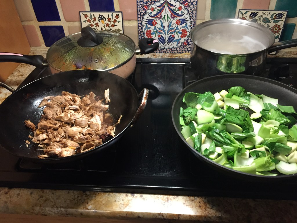 According to the recipe (https://www.epicurious.com/recipes/food/views/soy-sauce-chicken), soak two cups of sliced rice cakes in 3 cups of hot tap water that’s been microwaved for 30 seconds; drain and save about 1/3 cup of water. While they are soaking, chop three cups of leafy greens (fortuitously I had baby bok choy in the vegetable bin). I did not have the shiitake mushrooms, carrots, or bean sprouts, so I added 2 chopped celery stalks. Mix 1 ½ tablespoons of soy sauce and 1 tablespoon of black bean garlic sauce (another missing ingredient).
