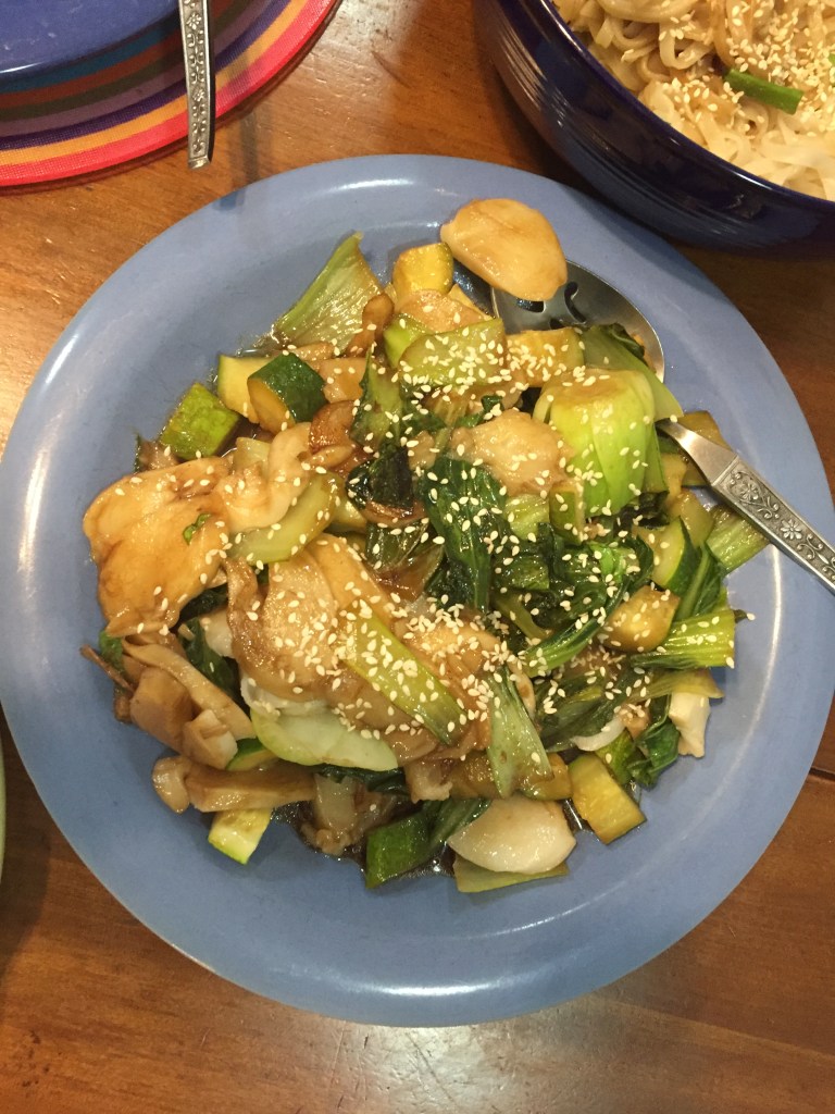 Longevity Noodles, eaten to insure a long life. I used brown rice noodles from Aldi, cooked according to the directions, then tossed in chopped scallions and some sesame oil and soy sauce.