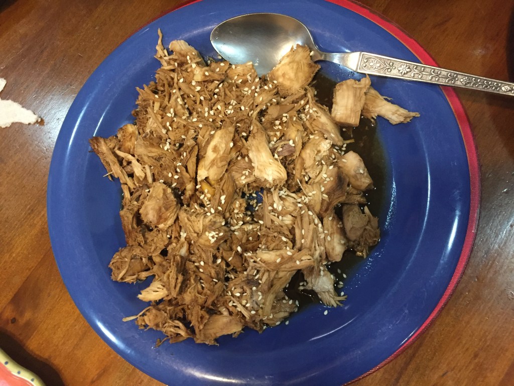 Soy Sauce Chicken. This recipe (https://www.epicurious.com/recipes/food/views/soy-sauce-chicken) called for a whole chicken, chopped up, and fried in a wok. In my efforts to clean out our very-full freezer I made changes to the recipe. I used a cooked turkey breast from the freezer.