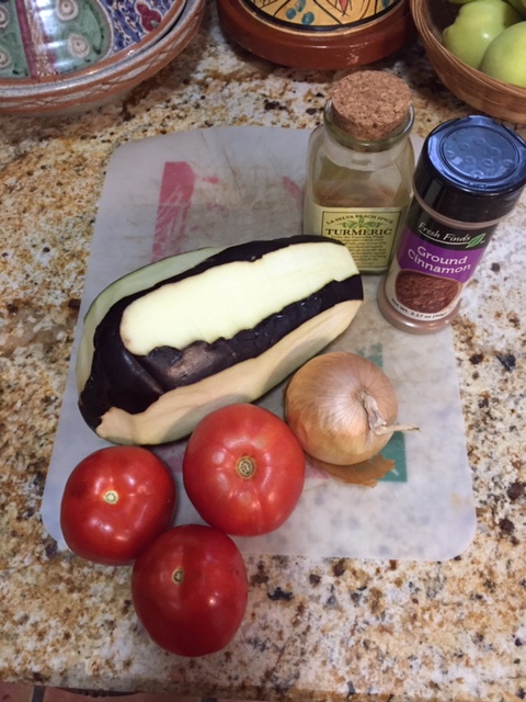 Eggplant Khoresh. As usual, I adjusted the recipe to what the pantry held: one large eggplant, three tomatoes, one onion, and the seasonings. The recipe in the article includes lamb, mine was meatless.