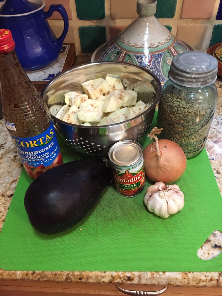 Eggplant and Lentil Stew with Pomegranate Molasses. Our family enjoys lentils, so this sounded like it would pass muster. It does and I’ve cooked it twice already.