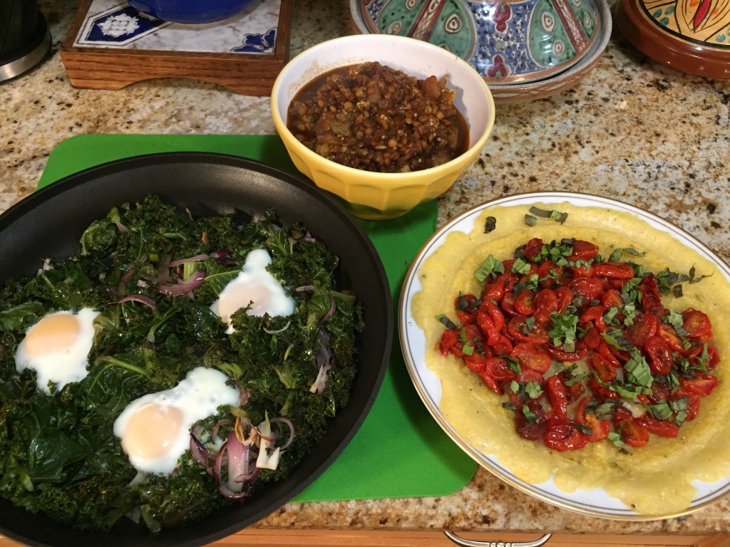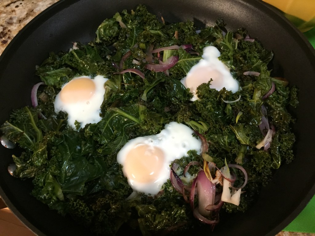 I might had a recipe at one time, but I like to improvise according to what’s on hand. The original was for Swiss chard with fingerling potatoes. This time, I had eggs, kale, onions. You can also add chunks of zucchini or yellow squash, which you brown in a sauté pan with the onion, salt and pepper (and garlic if you like) before dumping in the kale. When you cook with kale or other greens, you cook them down a little, then add more, and continue until you pan is full of lovely wilted vegetables. When the concoction seems almost done, make a few wells in the greens (one for each egg), crack the eggs, cover, and cook about 5-7 minutes more. It’s an easy meal if you should have a drop-in vegetarian guest (those were the days!) at dinner time.