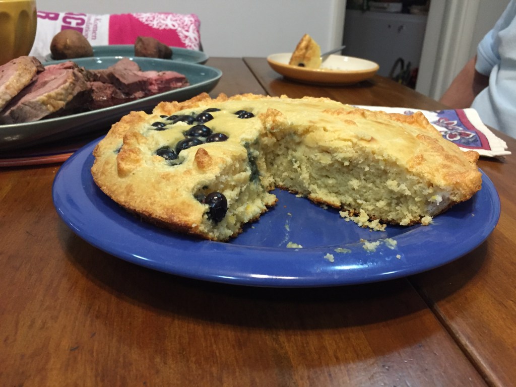 Melt 2 tbsp of butter in a heated skillet or oven-ready sauté pan (I sprayed it with non-stick spray). Add the batter to the pan in an even layer. I topped half with blueberries, half without in deference to Daughter who does not like blueberries. Bake for 25-30 minutes, til puffed and golden brown. We enjoyed this easy to make dish with last night’s dinner. It made a nice dessert for our dinner.