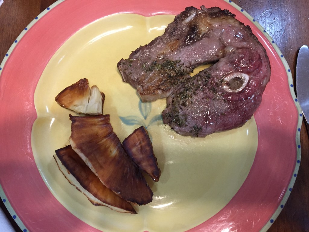 This beautiful green orb was roasted for dinner the next evening. Cut out the stem end and cut a cross in the other end and roast at 350 for an hour. When it’s done, cut in half, remove the center part, peel, slice, and eat. Delicious!