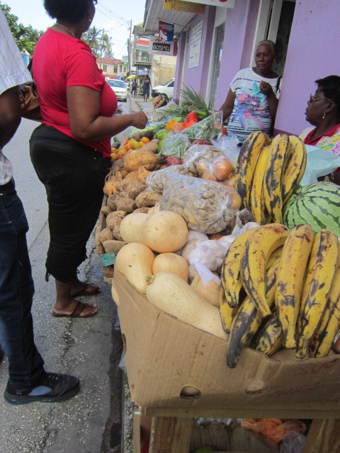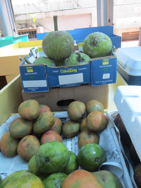 The breadfruit brought another trip down memory lane. A few years ago I was participated in a museum conference in Barbados hosted by the National Museum of Barbados. Most of us participated in a post-conference tour to see more of the island and learn its history after our business was done. In Bridgetown and Speightstown, I broke away from the group for a few moments to peruse their markets and see what deliciousness was in season. Note the breadfruit in the back of the photo to the left.