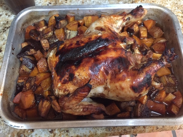 Spray a large ovenproof pan. Arrange eggplant, butternut squash, and chicken* in the pan making sure chicken does not cover the vegetables. Top with remaining marinade. Roast for 45-50 minutes in a 400 degree oven. From time to time baste the chicken with juices.