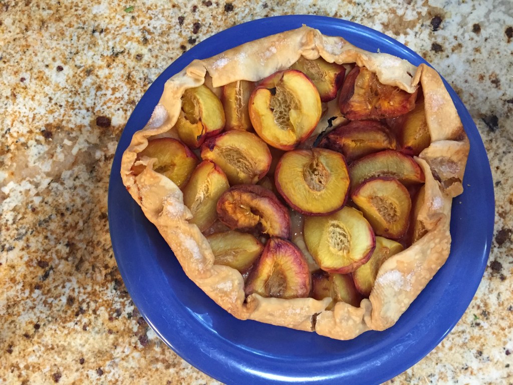 We had dessert that night, a peach crostada or gallette (I do not know the difference). Open a ready-made pie crust. Half the peaches (or nectarines, I think I had a mixture of both) and arrange them on the crust leaving about a 2” edge all around. Gently fold the edges in, sprinkle the edges with a little bit of sugar. We love sweet as much as the next person, but I use no or very little sugar in desserts like this relying on the sweetness of the fruit.