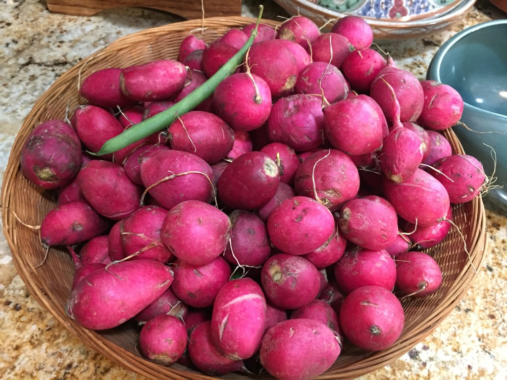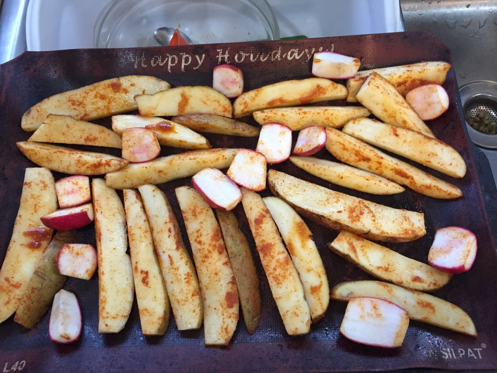 Oven baked French fries go well with this meal. Cut 3 baking potatoes as thin or thick as you like. This time, I tossed them with 1 tsp each paprika, onion powder, and garlic powder and about 3 tbsp olive oil. Put in a preheated oven, 400 degrees for about 45 minutes. I forgot about the radishes nestled among the potatoes. Last week’s food distribution was enriched by recent harvests – zucchini, string beans, and radishes. I had already tried roasting them with chicken and tried this time with the baked fries.