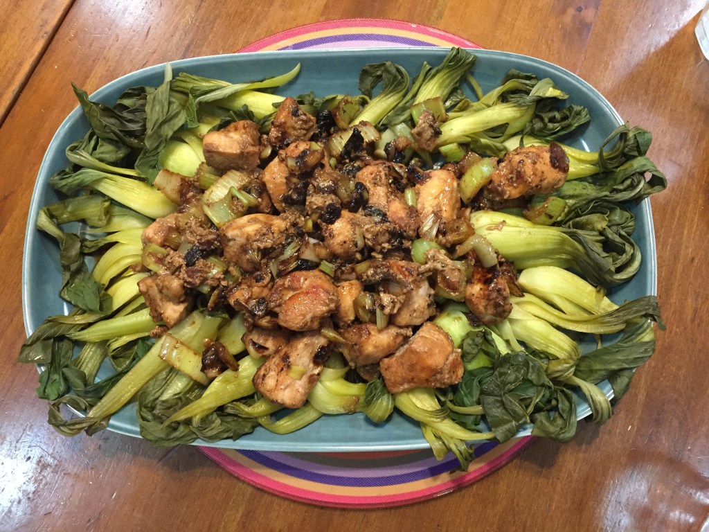 Cut up about one pound of skinless, boneless chicken breasts. Marinate in ¼ cup soy sauce, 2 tbsp sesame oil, 2 tbsp rice wine vinegar, some grated sugar, some brown sugar. Heat a wok or sauté pan and stir fry til chicken is no longer pink inside, about 8-10 minutes. Top with thinly sliced scallion and minced garlic. It was delicious.