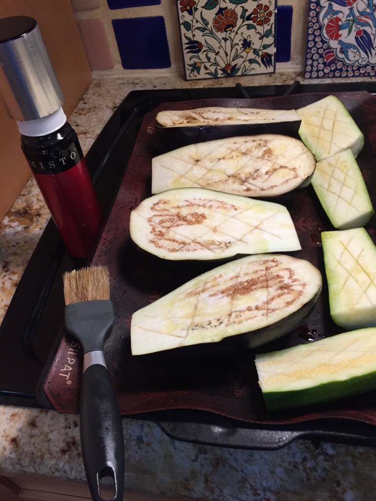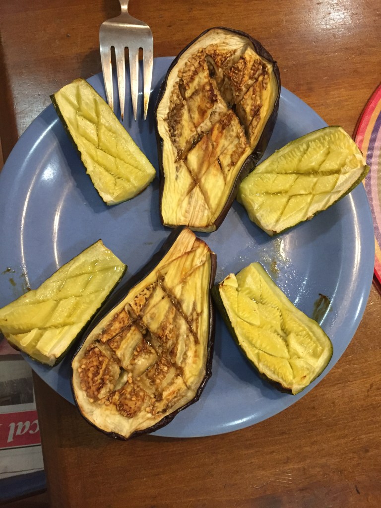 Recalling friends. Our bounty of vegetables this week included beautiful zucchini and eggplant. I was inspired by a roast eggplant with tahini sauce our friends served one evening. This is really easy, Half the vegetables, then score the flesh in a cross-hatch pattern. Brush with olive oil and a little bit of salt. Bake at 350 degrees for 25-35 minutes.