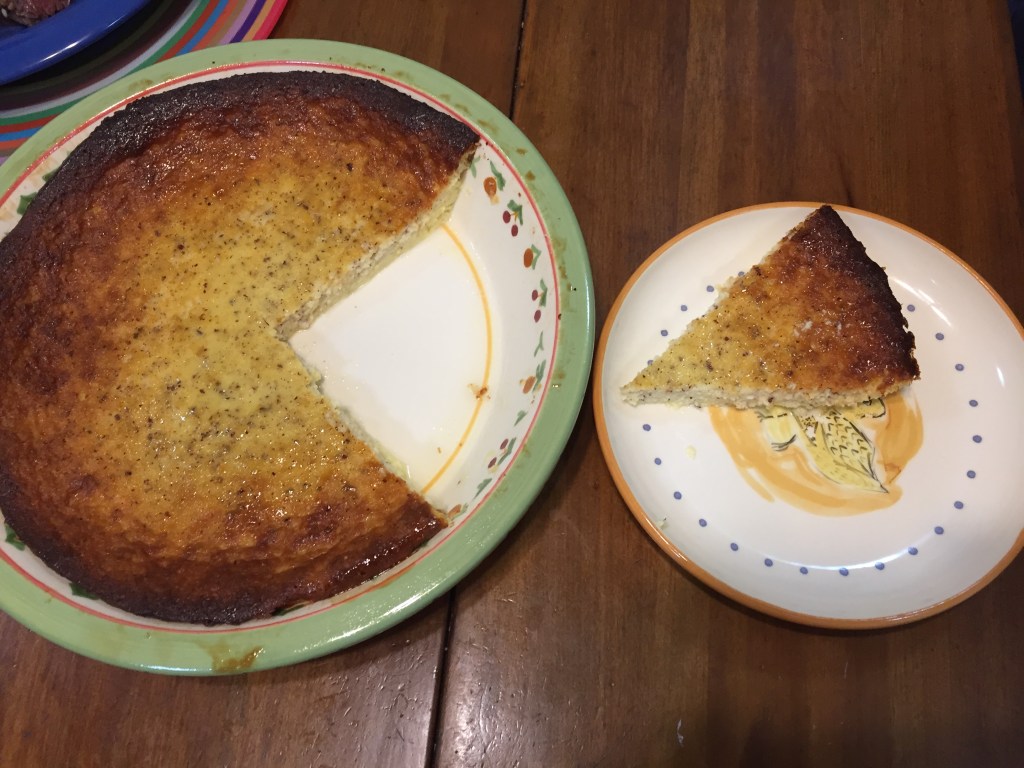 Crustless Ricotta Pie. Preheat oven at 350 degrees F. Beat 4 eggs with a hand mixer, adding one at a time. Add 1 cup sugar, 1 tsp lemon zet, 1 tsp vanilla (or cinnamon), and ¼ cup flour (I used almond flour). Mix thoroughly. Pour into a greased pie pan. Bake for 45 minutes, until firm and browned.