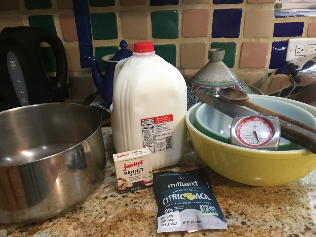 Adventures in cheese making. I’ve been reading that making mozzarella is not too difficult. First step, Google to peruse varied and sundry instructions. I chose this one – https://cheesemaking.com/products/30-minute-mozzarella-recipe. Next, assemble the correct ingredients – milk, rennet, and citric acid; Amazon was the source of the last 2 items, the rennet in particular was nowhere to be found nearby.