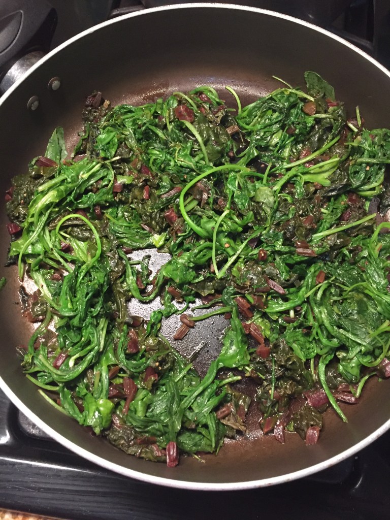Tip: Any green will do in place of spinach. I used beet greens and arugula. Get to know your produce man at the grocery store. When I see fresh beets topped with greens, I ask mine for the greens which he kindly breaks off and gives me. Many customers just throw them away. They have a nice bite to them.