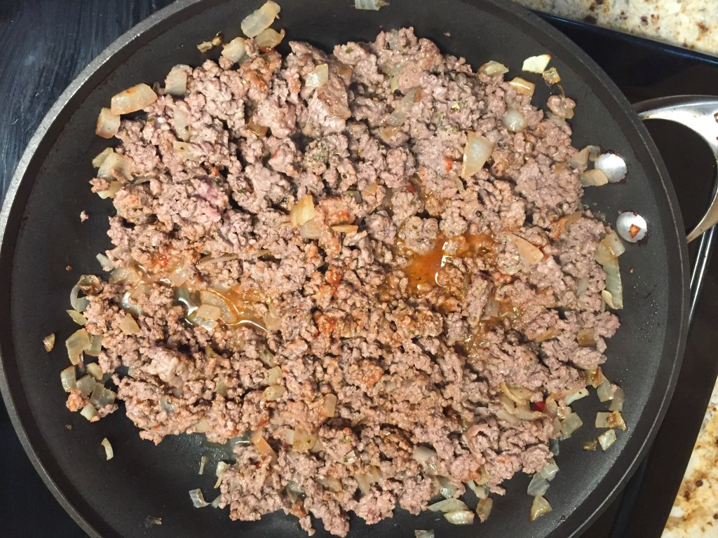 Step one. Saute 1 ½ cups of chopped onions in oil. Add 1 ½ cups of ground beef and brown. Drain off the excess fat and add ¾ tsp salt, 3/4 tsp ground pepper, ¾ tsp oregano (mine is from Athens’ central market), 1/3 cup tomato paste, ¾ cup parmesan*, 2 eggs beaten, and mix well.