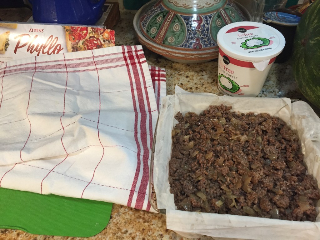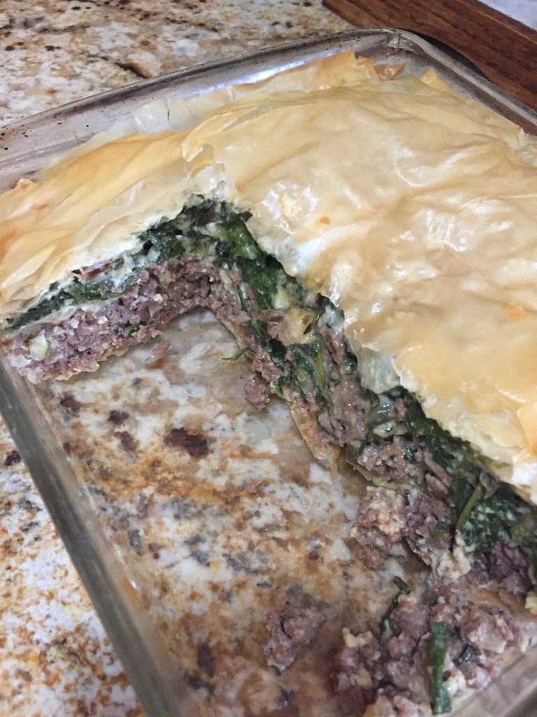 Meat, spinach, and cheese pie. There are three steps; first prep the meat filling, then the spinach filling, then fill. Believe me, it is really not difficult and well worth the effort.