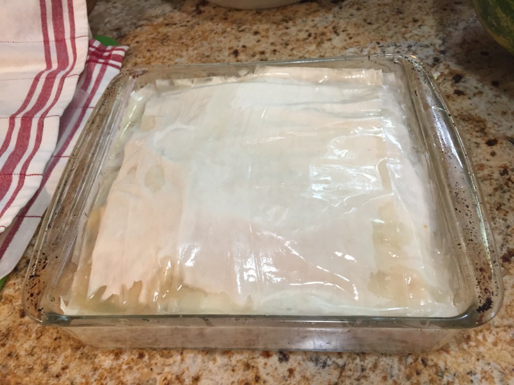 Step Three. Working with filo might seem challenging, but it’s really not. Some tips: if it’s frozen, remove it from the freezer with enough time to thaw (about 3-4 hours). Make sure that you keep the filo leaves covered with a kitchen towel as you work to prevent it from drying. Don’t worry if your leaves crack as you arrange them, they cook just the same.