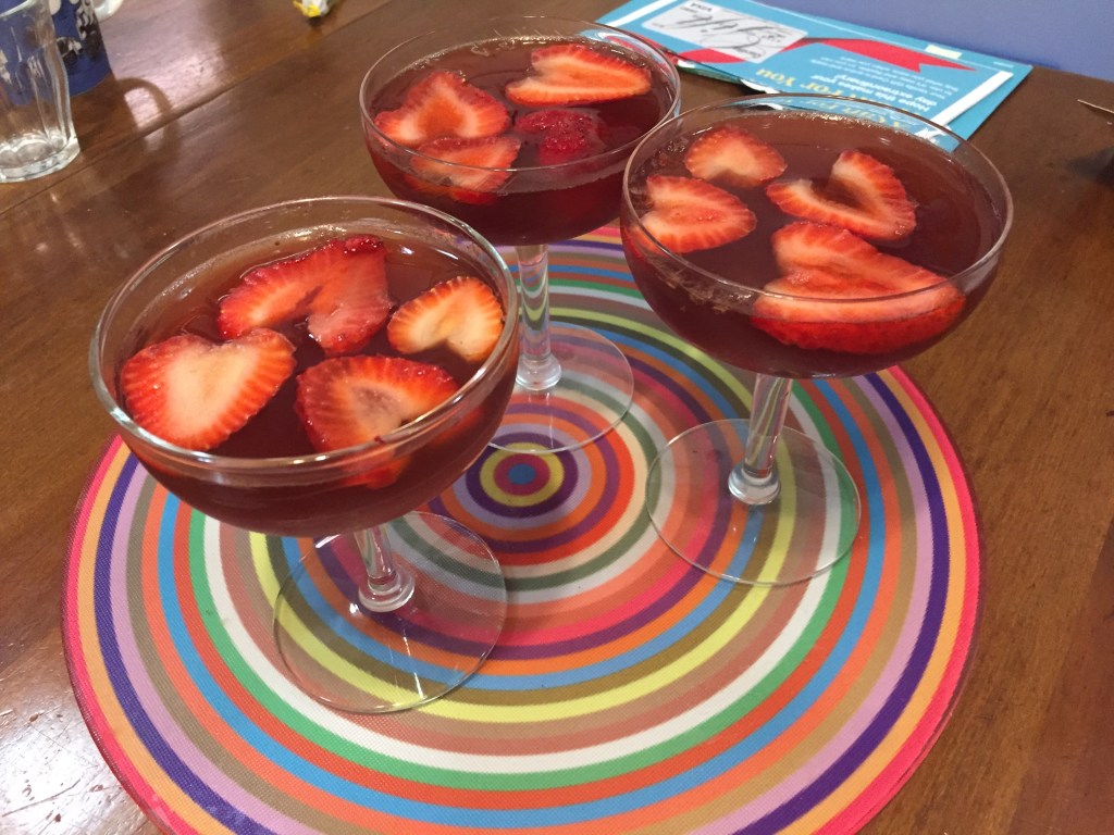 It was a birthday, something more was needed. I felt compelled to try a new gummy recipe, this time with hibiscus and lovely fresh strawberries. A package of hibiscus tea purchased at a long ago museum conference in Croatia had been stashed in my tea cabinet for quite a while (see Dec. 30, 2019). Two recipes were combined: one for hibiscus tea and one for the gummies. Steep the entire package of tea in a glass bowl with 4 cups of boiling water. Following the tea recipe, let it sit for 2 days, then strain. Next, sprinkle two envelopes of unflavored powdered gelatin into 1 cup of warmed tea, let it sit for about 5 minutes, then mix it with the remaining 3 cups of tea along with 1/2 cup of sugar and 1 tbsp lemon juice. Heat til all are dissolved. Pour the mixture into molds; I used loved Art Deco champagne coupes. After about 30 minutes poke the berries* into the gummies and refrigerate at least 4 hours or overnight.