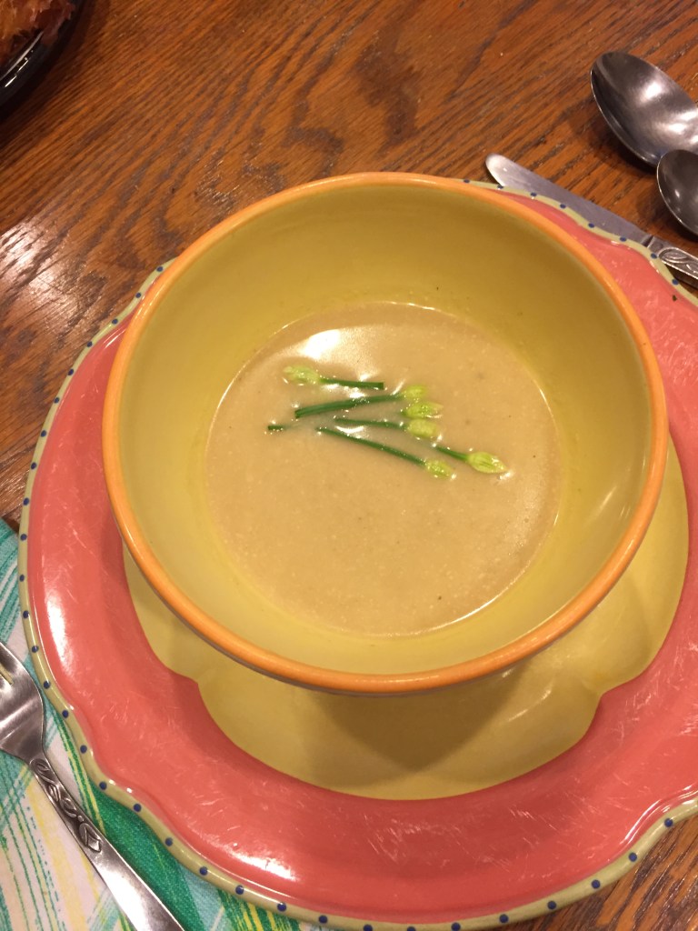 Chickpea soup with almonds is a Mark Bittman recipe, very easy. Cook a thinly sliced small onion, some smashed garlic, and half a cup of slivered almonds in some olive oil. Season with salt, pepper, and a pinch of smoked paprika. Add a can of chickpeas with their liquid and four cups of chicken broth or water. Bittman recommends using a potato masher to break down some of the chickpeas, I used my immersion blender. Cook and stir til warmed through. He recommends serving with chopped parsley, I topped each bowl with some of the chive flowers, added a nice bite.