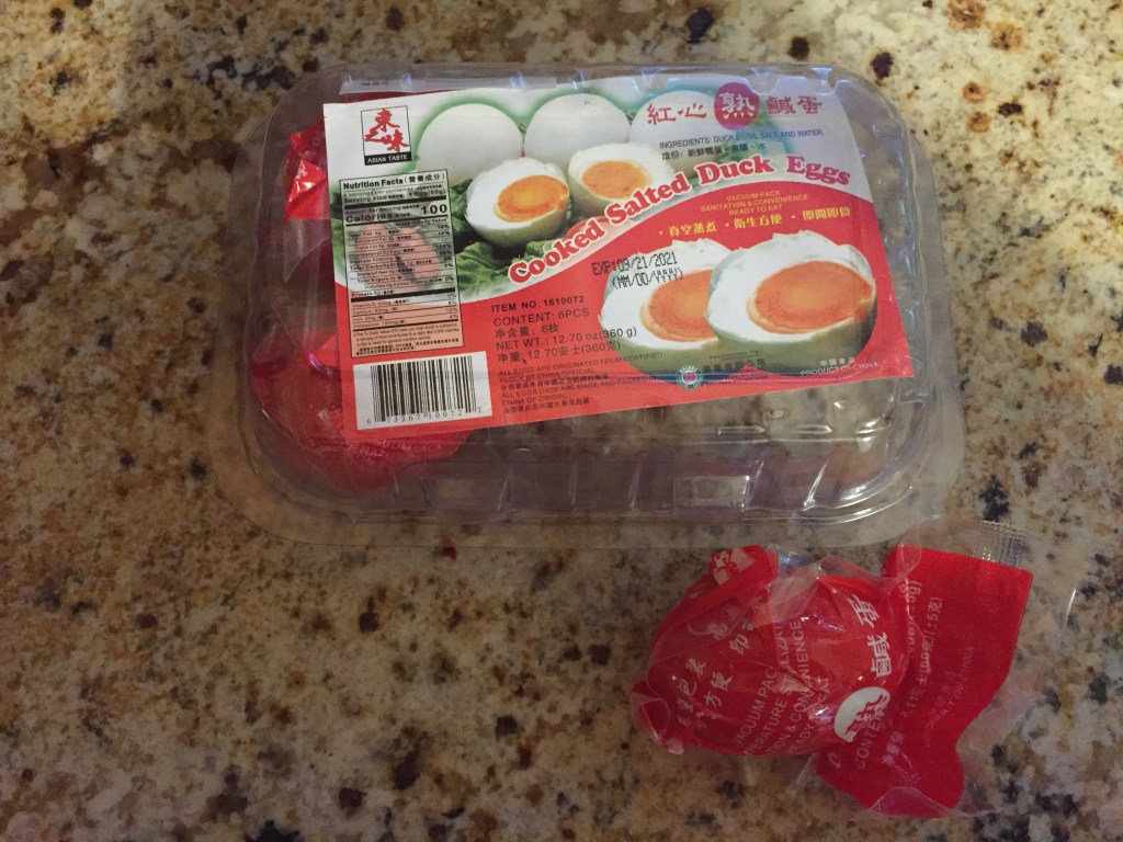 *A while ago, Daughter and I were out and stopped at an Asian market. This product intrigued her. It sat on the pantry shelf for a while. One day when I came home she told me that she’d eaten one; it left lots to be desired. I turned to Google as is my practice and found that these salt eggs can be incorporated into dishes in place of salt. What to with the remaining eggs?