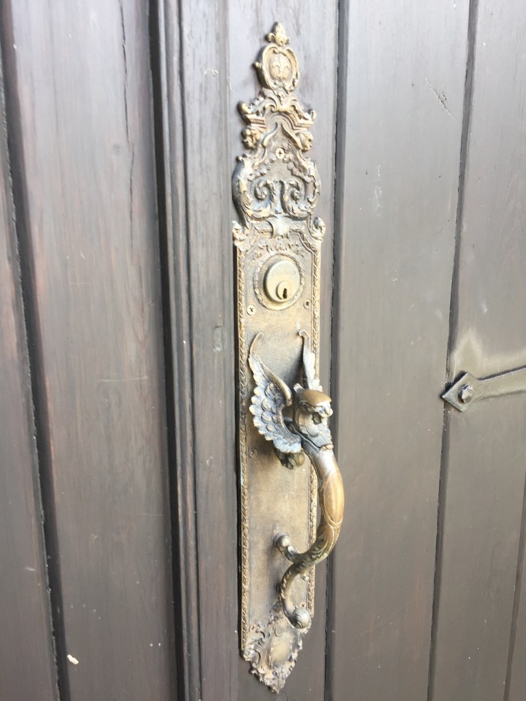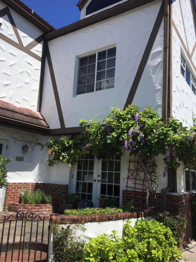 Constructed in 1926-1927, designed by architects John and Coulton Skinner, the attached dwellings are supposed to resemble a fifteenth century French village. It’s difficult to see much beyond the white stucco walls as you walk around the block. However, the profusion of flowers is amazing with wisteria and bougainvillea.