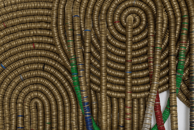 Again, quoting the curator’s text, Soal “examine(s) the socio-political context of their making whilst highlighting the histories embedded in the round and disposable material.” The large toothpick piece, a graceful, intricate mass of undulating patterns and variegated colors, hid no higher, denser social meaning from me.