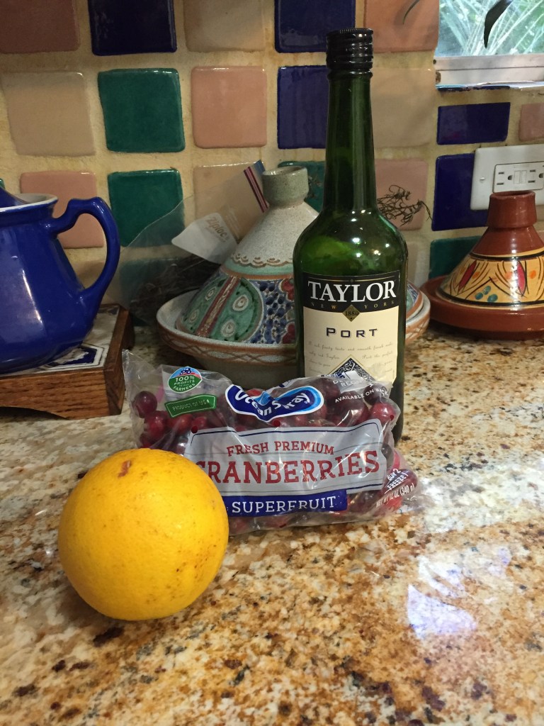 Port-Cranberry Sauce. Combine the ½ port with ½ orange juice and three 1×3 inch strips of orange zest (I just chunked up a thick-skinned orange in place of the zest) in a saucepan, bring to a boil. Add 12 ounces of cranberries and ¾ cup of sugar* and simmer over moderately low heat about 25 minutes. Serve warm or room temperature.