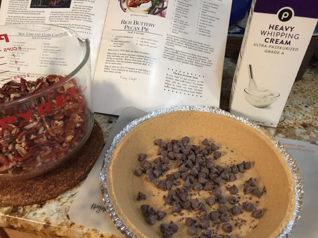 Remove from heat; stir in ¼ cup heavy cream and 4 cups (1 pound) of pecans. Pour into pie crust (I sprinkle a handful of chocolate chips in the pie crust first!) Place pie on a cookie sheet.
