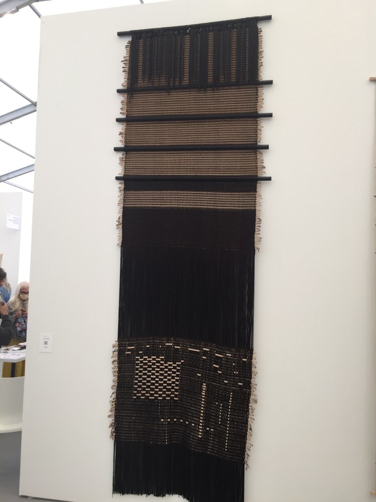 Finally … somehow I missed the amazing works by Kira Dominguez Hultgren (https://www.kiradominguezhultgren.com/) on display at the Eleanor Harwood Gallery booth. Of course, this was one of the many stops CC made in his inimitable way through the fair. Like many other folklore students interested in textile traditions, I was introduced to the outstanding Indiana coverlets woven by itinerant weavers on jacquard looms in the 19th century. These looms were proto computers that allowed weavers to create intricate patterns, and leave their signatures in their works. Hultgren works on a jacquard loom to create her message-filled works. Thank you CC for catching what I missed!