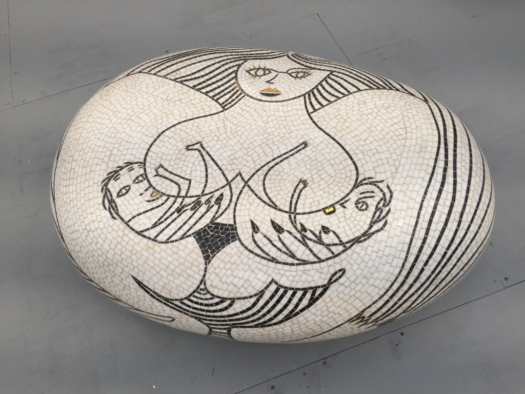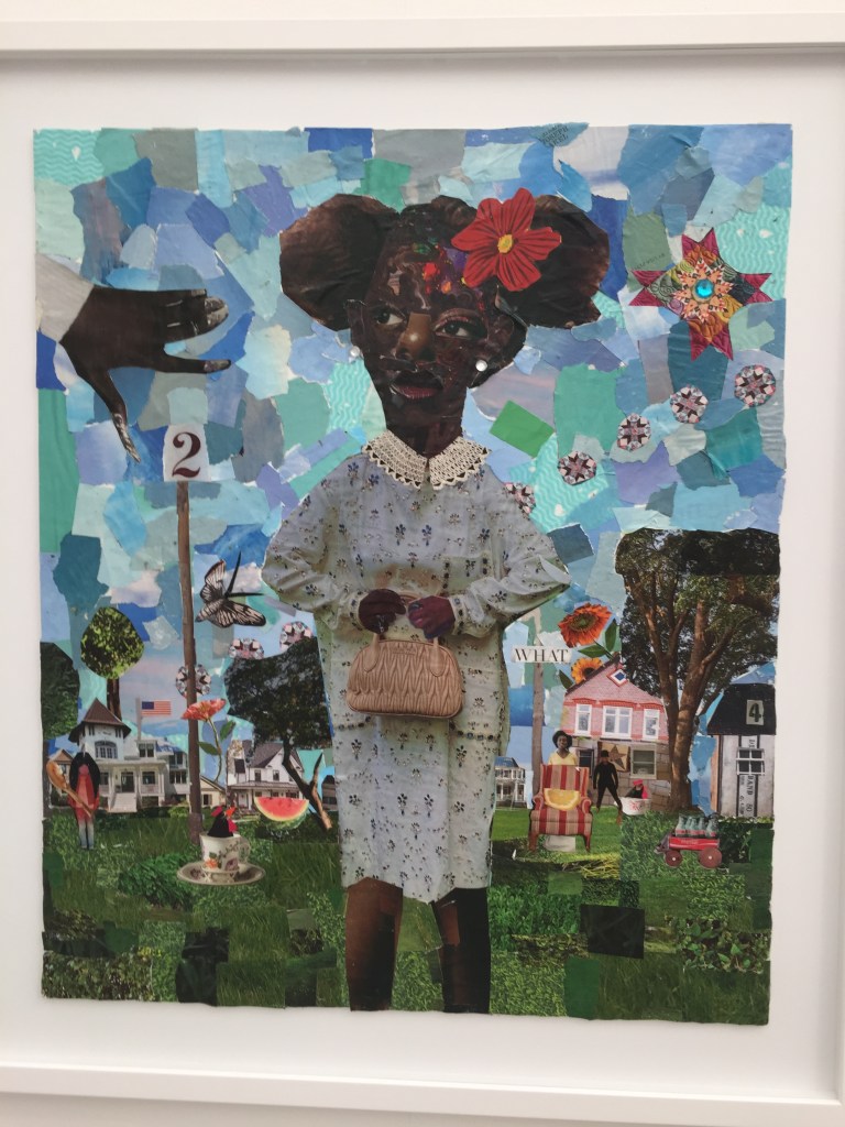 Mosaics and collages also caught my eye along the way during my ramble: the mosaics by Summer Wheat (https://summerwheat.com/) and collages by Della Wells (https://www.portraitsocietygallery.com/dellawells). These are two media which I noodle around with. Don’t let the image of the mosaic fool you; this piece is large enough to sit on.