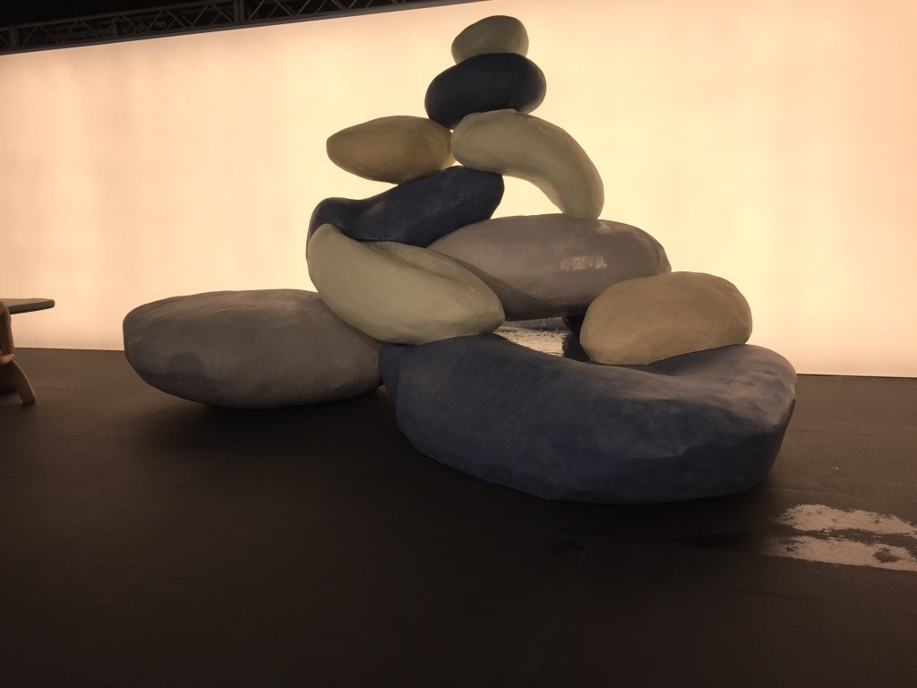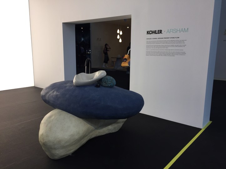 ,What else did we see? Stone Flow is a unique collaboration between artist US artist Daniel Arsham and Kohler the global plumbing manufacturer. The giant rocks in this massive installation emulate the design of the innovative sink, Rock.01 (https://www.artfixdaily.com/artwire/release/9340-kohler-x-daniel-arsham-debut-%E2%80%9Cstone-flow%E2%80%9D-and-rock01-at-design-mi). Arsham’s a 3D-printing technique uses vitreous ceramic. The work was designed in part as an initiative to lower the amount of water used in the company’s designs. Proceeds will support clean water projects for Navajo communities.