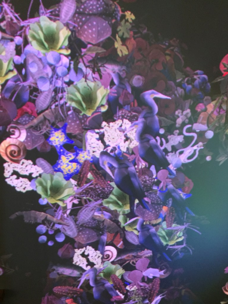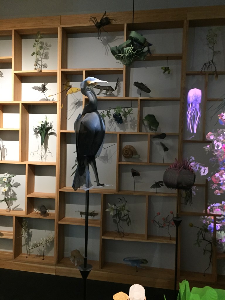 With the installation “Imbodied Nature,” Austrian design studio mischer’traxler and Maison Perrier-Jouët created a commentary on the importance of biodiversity with a complex setting showing many species that emphasize the interconnectedness of all life on the planet. Intricately constructed 3D figures are paired with digital projections as well as some interactive opportunities. Below, the cormorant is represented in 3D and in the digital projection.