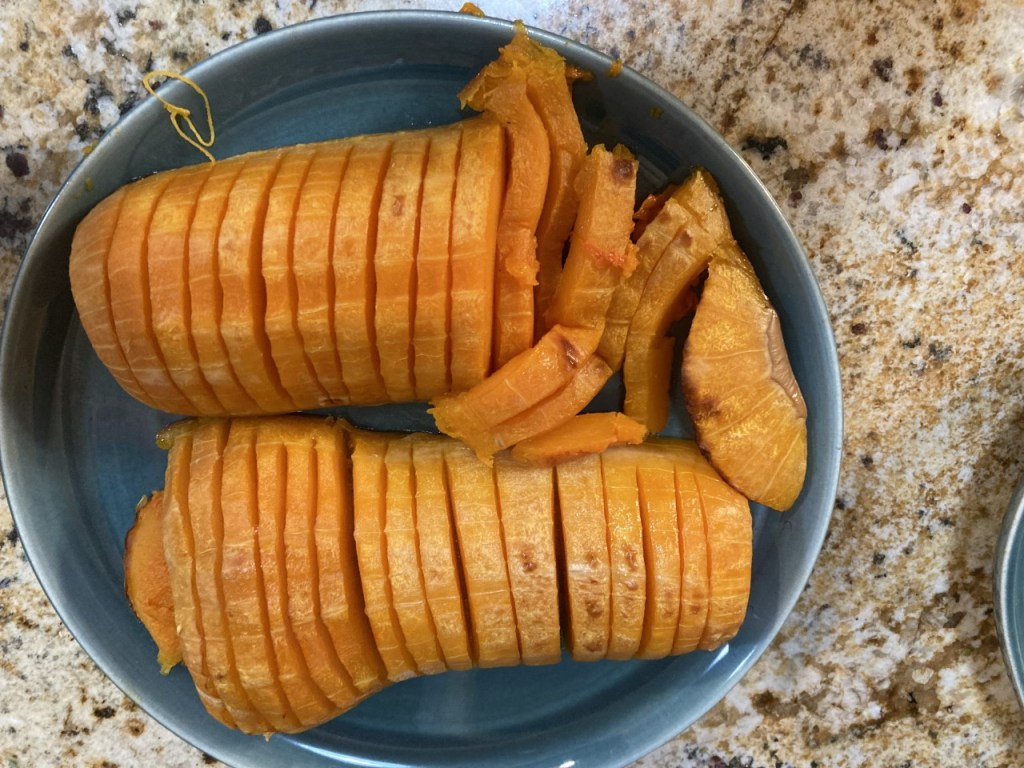 Hasselback Butternut Squash. I do not know the origin of this verb for thinly sliced, roasted potatoes and hard squashes. I’ve enjoyed adding the technique to my repertoire. The magazine recipe was much more complex using melted butter, sage leaves and maple syrup to add to the flavor of the squash. I find butternut squash sweet and buttery and use none of these ingredients – though sometimes I brush it with Korean gochujang mixed with date syrup (silan).