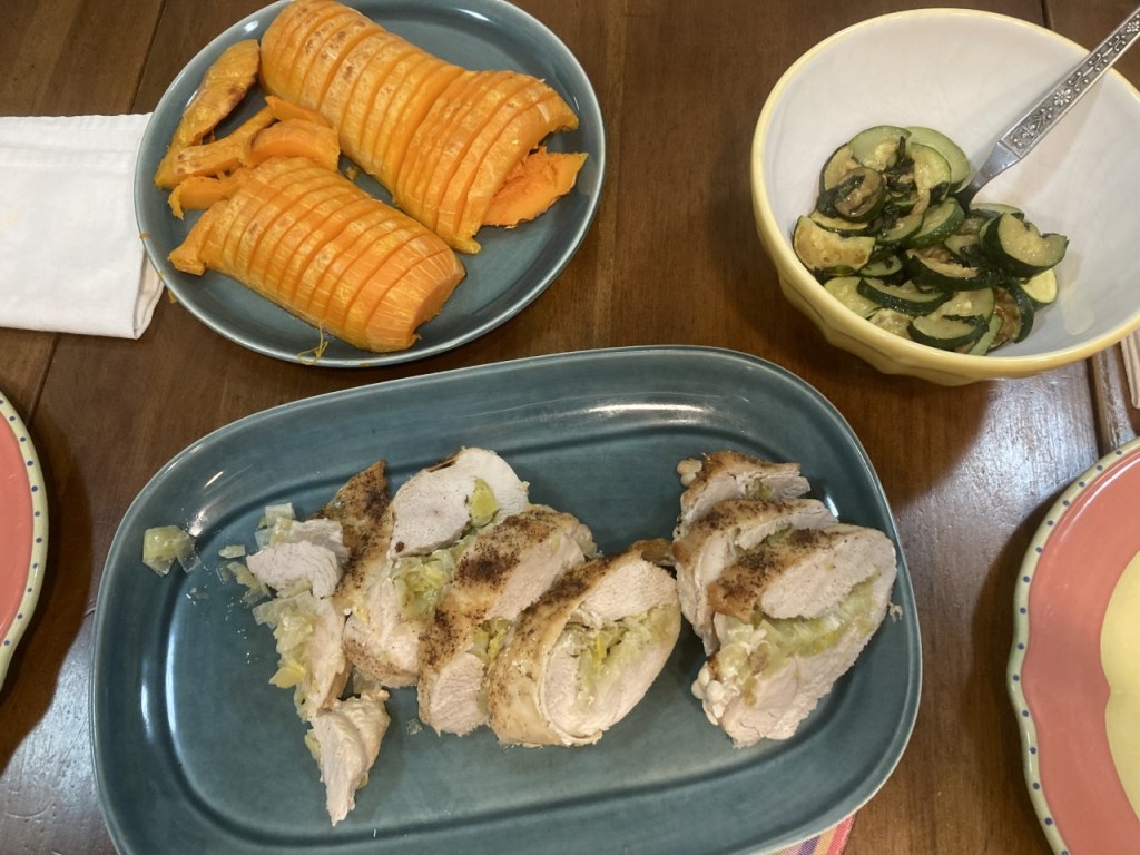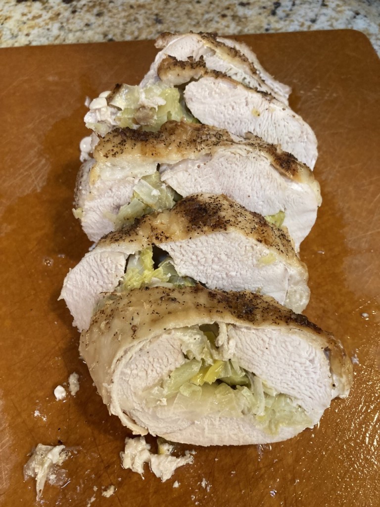 As 2021 was closing, I returned to that unbidden magazine with the interesting recipes. Two turkey breasts remained in the freezer that needed to be used. And also a butternut squash. It was time to make the intended Thanksgiving dinner – turkey roulade with hasselback butternut squash.