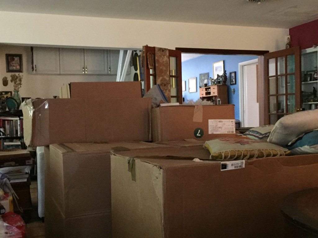 I’ve been riding an emotional roller coaster those long months of displacement. Luckily, our house has two bathrooms, so we were never without the necessities. Our living room, on the other hand, was taken over by the linen closet contents and boxes of stuff. Then the cartons of bathroom cabinets delivered in October took the form of a ziggurat* filling the center of the room.