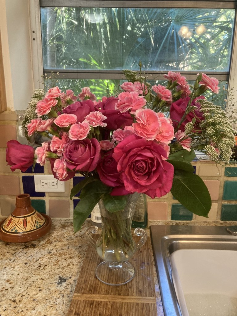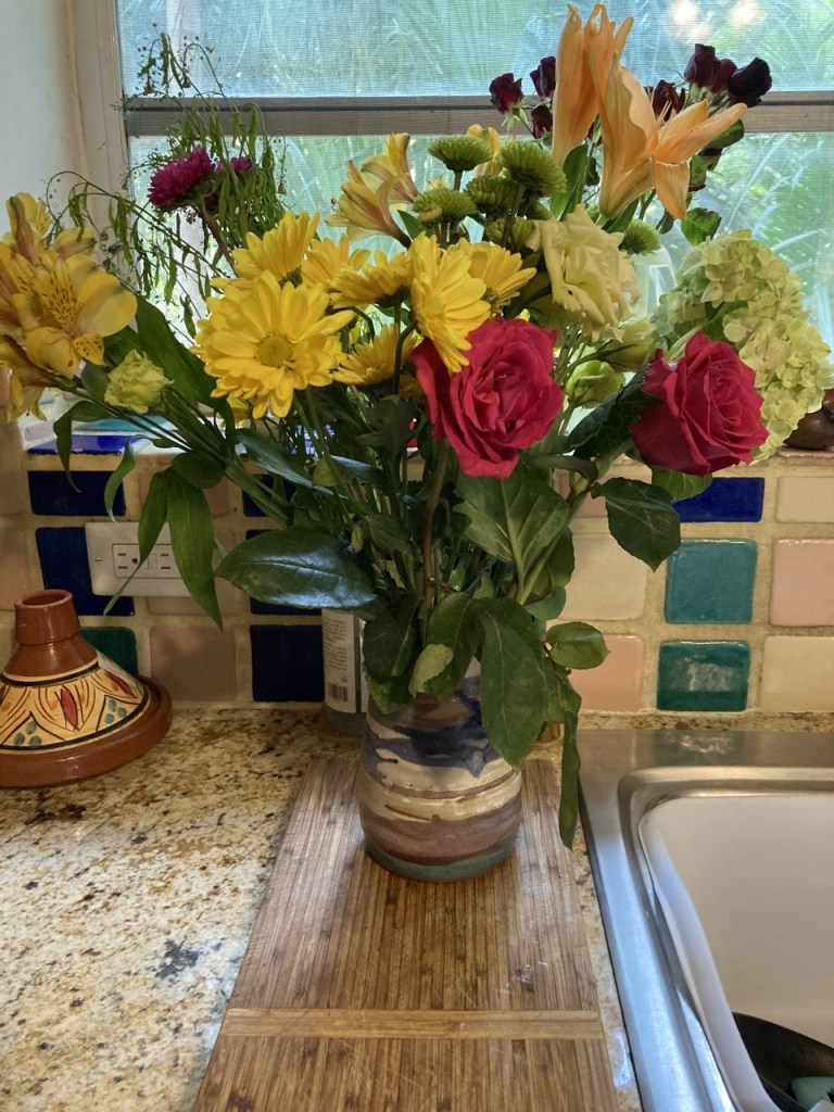Ever since then, one my aspirations has been to follow her decorating practice. Fresh flowers so perk up a home, adding beauty and an indescribable ambiance. Even though I do not come close to filling the house, flowers on the kitchen counter brighten my life!