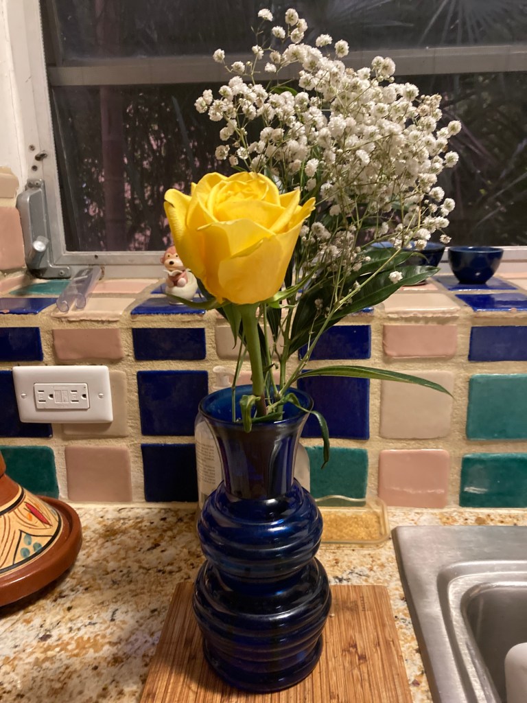 I came home on Friday to find this simple, lovely display, purchased before the rush of extravagant arrays sold for Valentine’s Day. I love it!