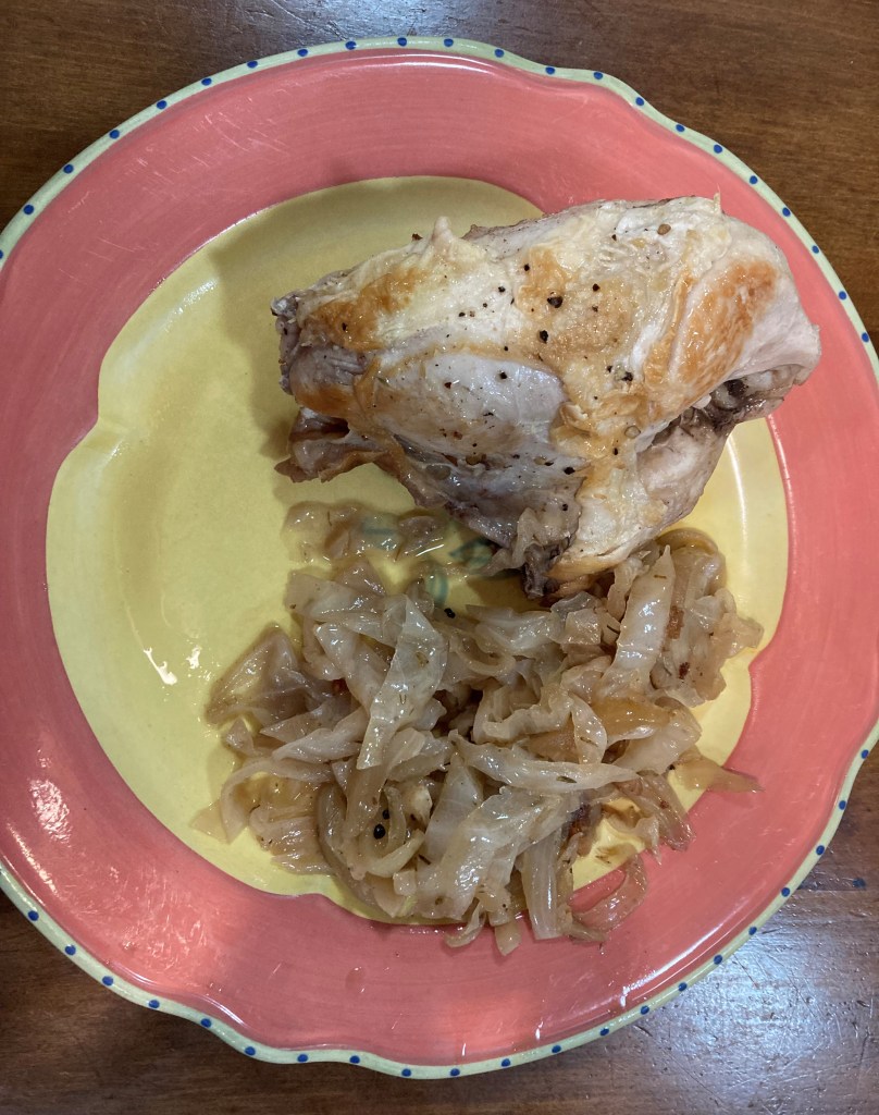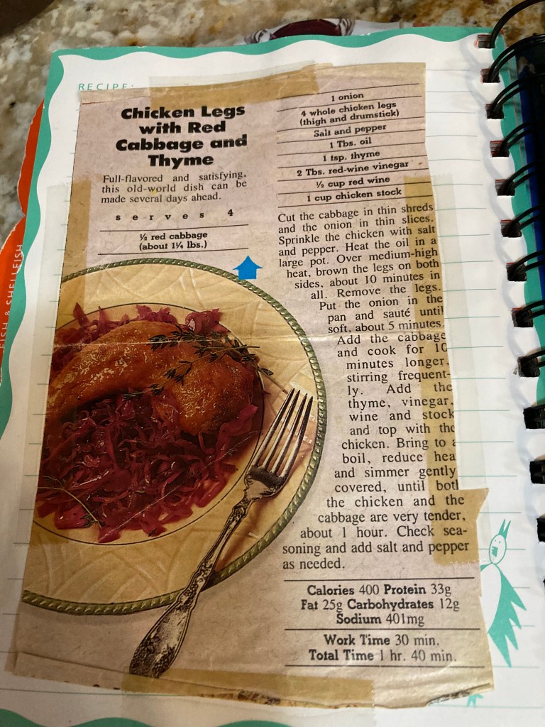 Chicken Legs with Red Cabbage and Thyme. Of course, the recipe calls for red cabbage (and the photo would be more lovely) and I had only green. Cut ½ cabbage and one onion into thin shreds. Sprinkle 4 whole chicken legs, with thighs attached with salt and pepper (I had just bone-in thighs). Heat oil in a large pot, medium high. Brown both sides of chicken, skin side first, about 10 minutes total (til browned). Remove and set aside. Saute onion for about 5 minutes, add the cabbage and cook 10 minutes longer, stirring frequently (I use my tongs to do this). Add 1 teaspoon thyme, 2 tablespoons red wine vinegar, ½ cup red wine, and 1 cup chicken stock. Scrape up any chicken bits sticking to the bottom of your pan. Top with the chicken and the pan drippings. Bring to a boil, reduce heat, and simmer covered for about an hour.