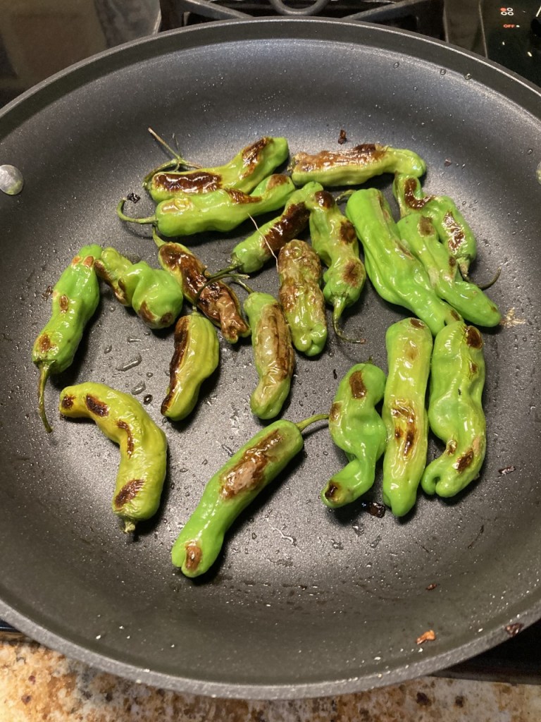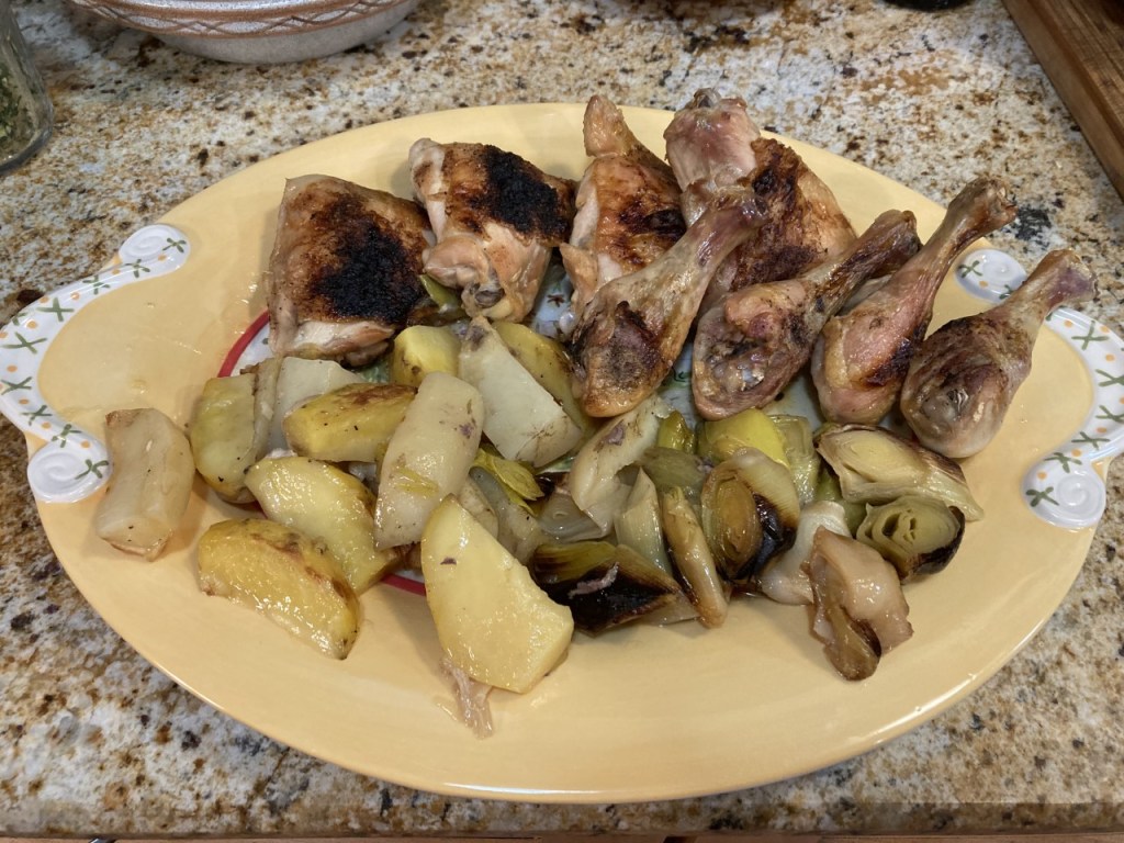 Saturday’s new recipes were Chicken with Potatoes and Leeks with Pine Nut Gremolata, from the April Food and Wine magazine. (https://www.foodandwine.com/recipes/chicken-potatoes-with-pine-nut-gremolata) along with sautéed dandelion greens and blistered shishito peppers. Warning, the gremolata takes lots and lots of chopping; it was well worth the work, a tasty addition to the dish.