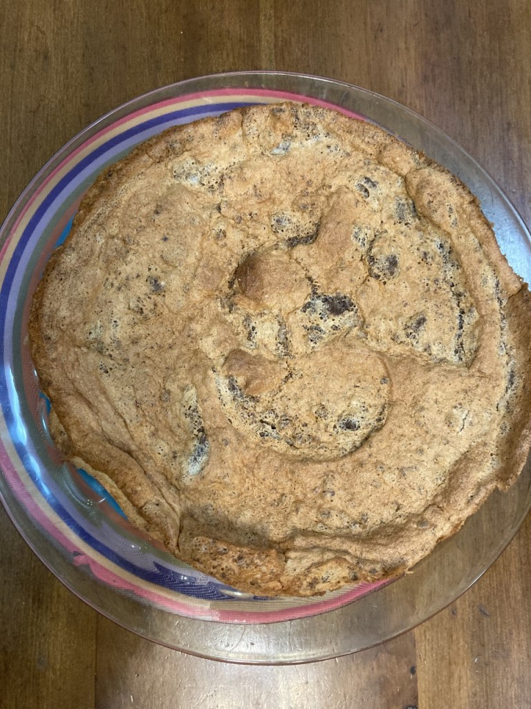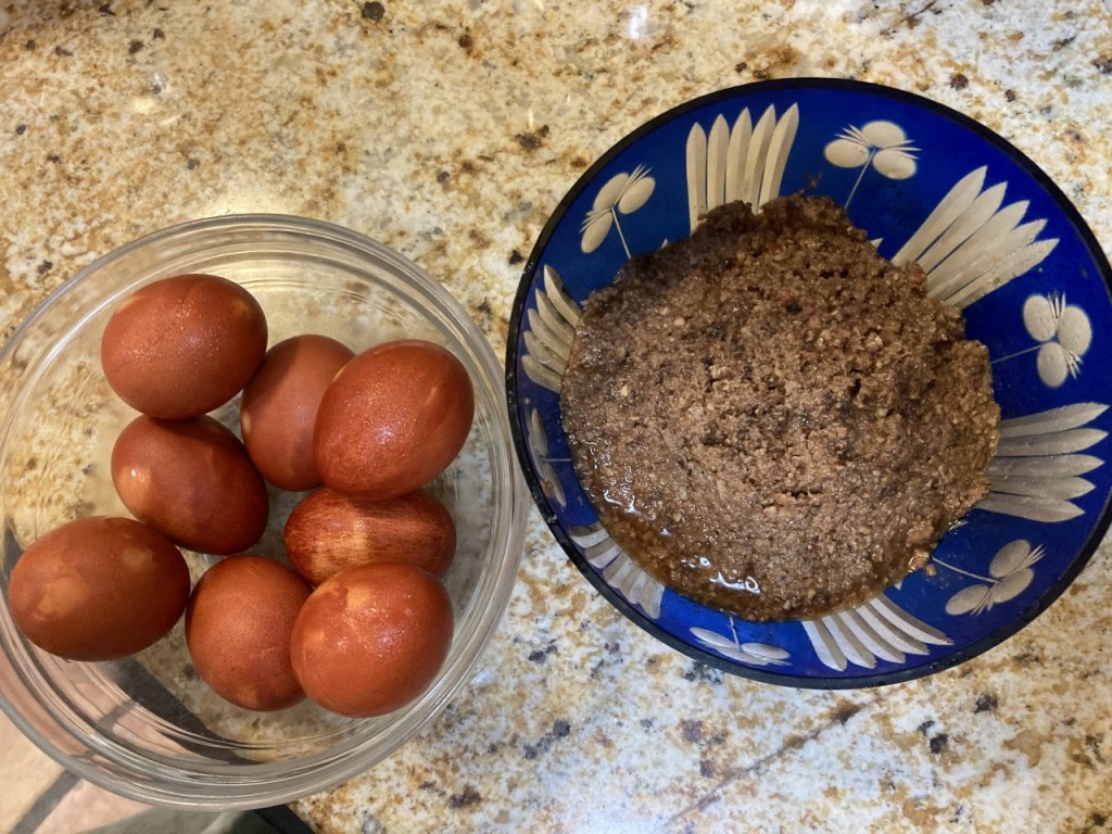 Somehow my aging brain, of decreasing grey matter, remembered a long ago, cut out recipe in the “Jewish foods” loose leaf folder (Family Circle, 1991)! Just in time for the carefully constructed cooking schedule. First seder this year was Friday evening. Thursday’s agenda included my huevos haminados (Sephardic brown eggs), soup stock (complete with whole chicken to be used later in the week), charoset (using my mother’s recipe, see 4-9-20 post), and said torte.