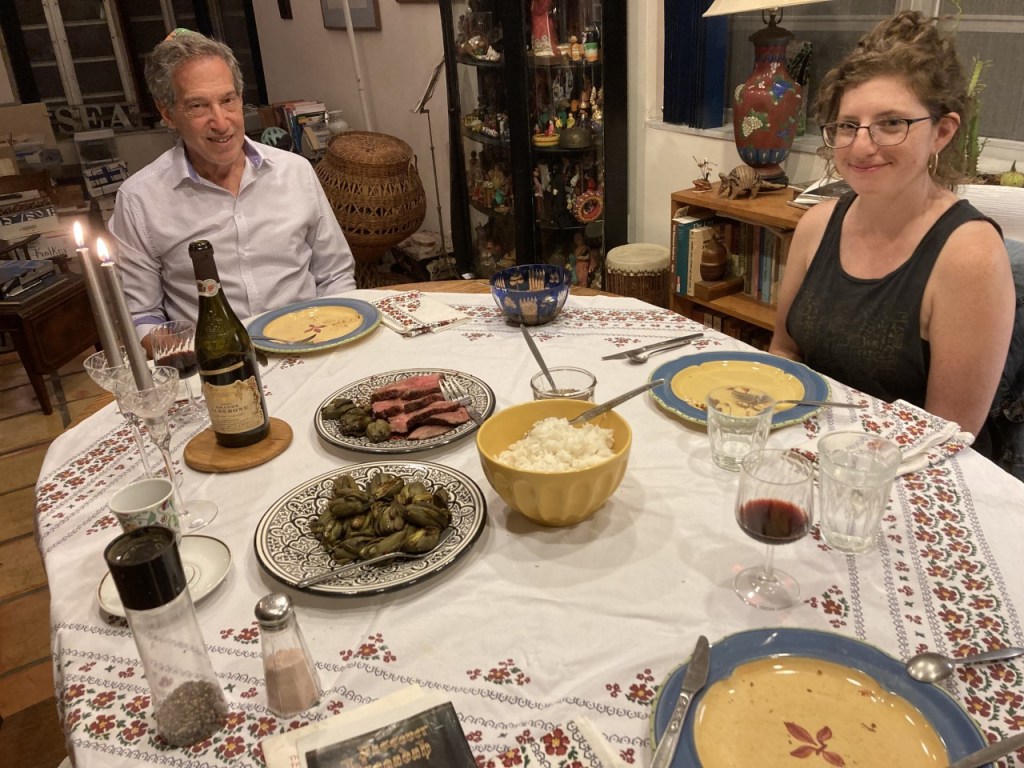 Actually, by the time I was able to identify where the recipe was secreted, it was prepared Friday morning. Friday’s cooking agenda included pre-cooking the baby artichokes (found unexpectedly at the local Fruiteria), finishing the soup and non-Greek matzah balls, and a new roast lamb recipe. Friday morning, I also had marzipan on the prep list – the recipe came from a zoom I watched in the past two years (see 7-12-21 post), a great new addition to my cooking repertoire.
