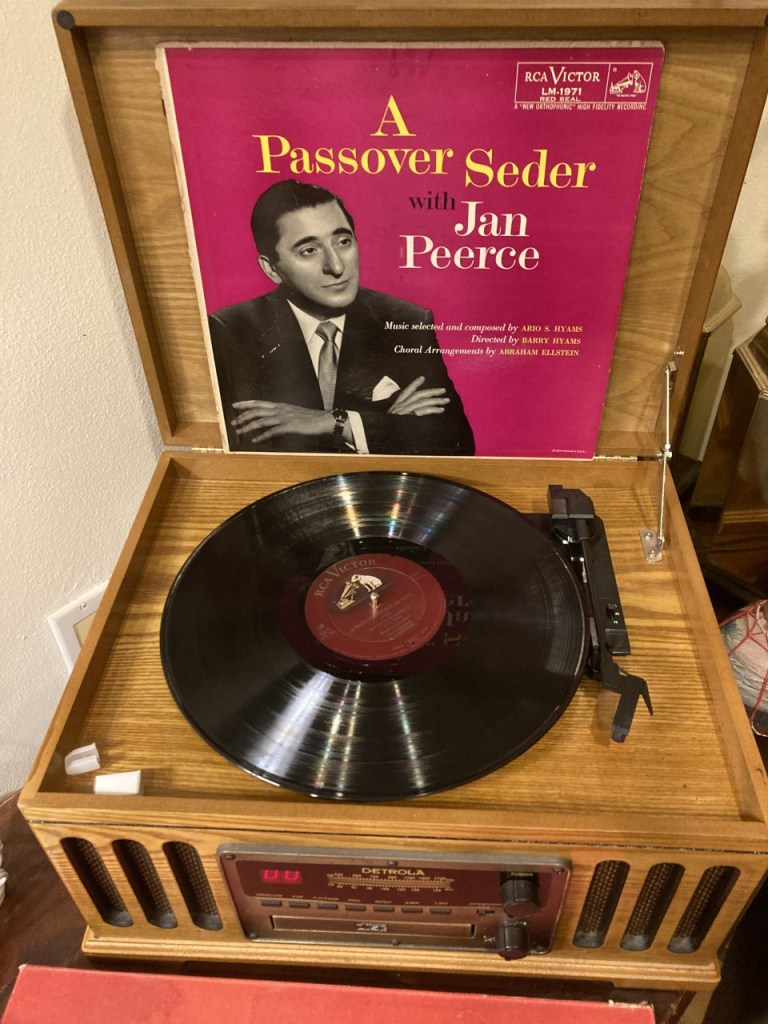An unusual feature of seder in our home occurs when it’s only the nuclear family. As we read the Haggadah we also listen to the old Jan Peerce record!