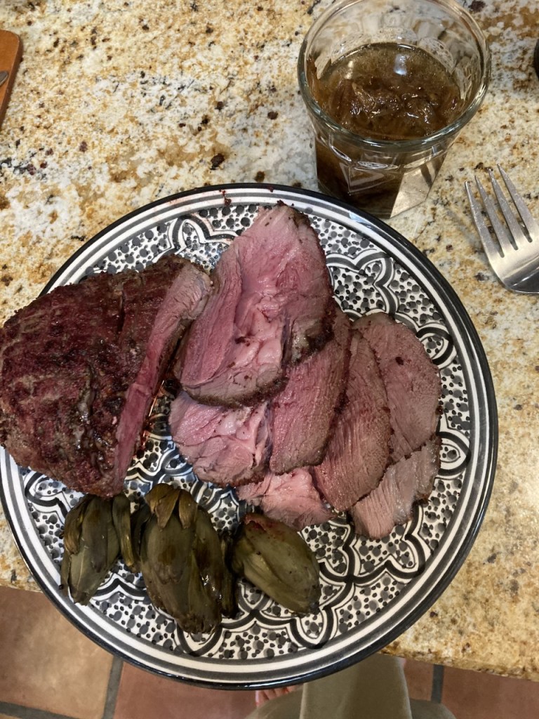We usually do two seders; each night this year I experimented with new recipes. Friday Night was Sumac Navajo Leg of Lamb with Onion Sauce, a recipe from our local paper, the recipe is available in other on-line sources (https://www.newmexicomagazine.org/blog/post/recipe-sumac-navajo-leg-of-lamb-with-onion-sauce/). I scattered the parboiled, halved baby artichokes in the roasting pan with the meat. This dish was among the best we’ve had; the tangy sumac paired with the onion sauce makes a lovely flavor profile.