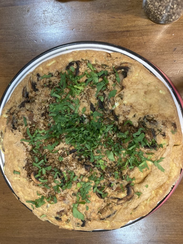The strawberry soup was part of a light Sunday night dinner. It was one of those clean out the fridge dinners making use of leftover brown rice and an overflow of mushrooms. A frittata was just the thing. First, Constant Companion put the rice with a little water into the microwave to hydrate it. Then in a skillet with a bit of olive oil, I fried it with salt and pepper. The thinly sliced mushrooms (about 8 ounces) were sliced and added to the rice, gently stirred til nicely softened. I topped these ingredients with chopped parsley and garlic chives from the garden.
